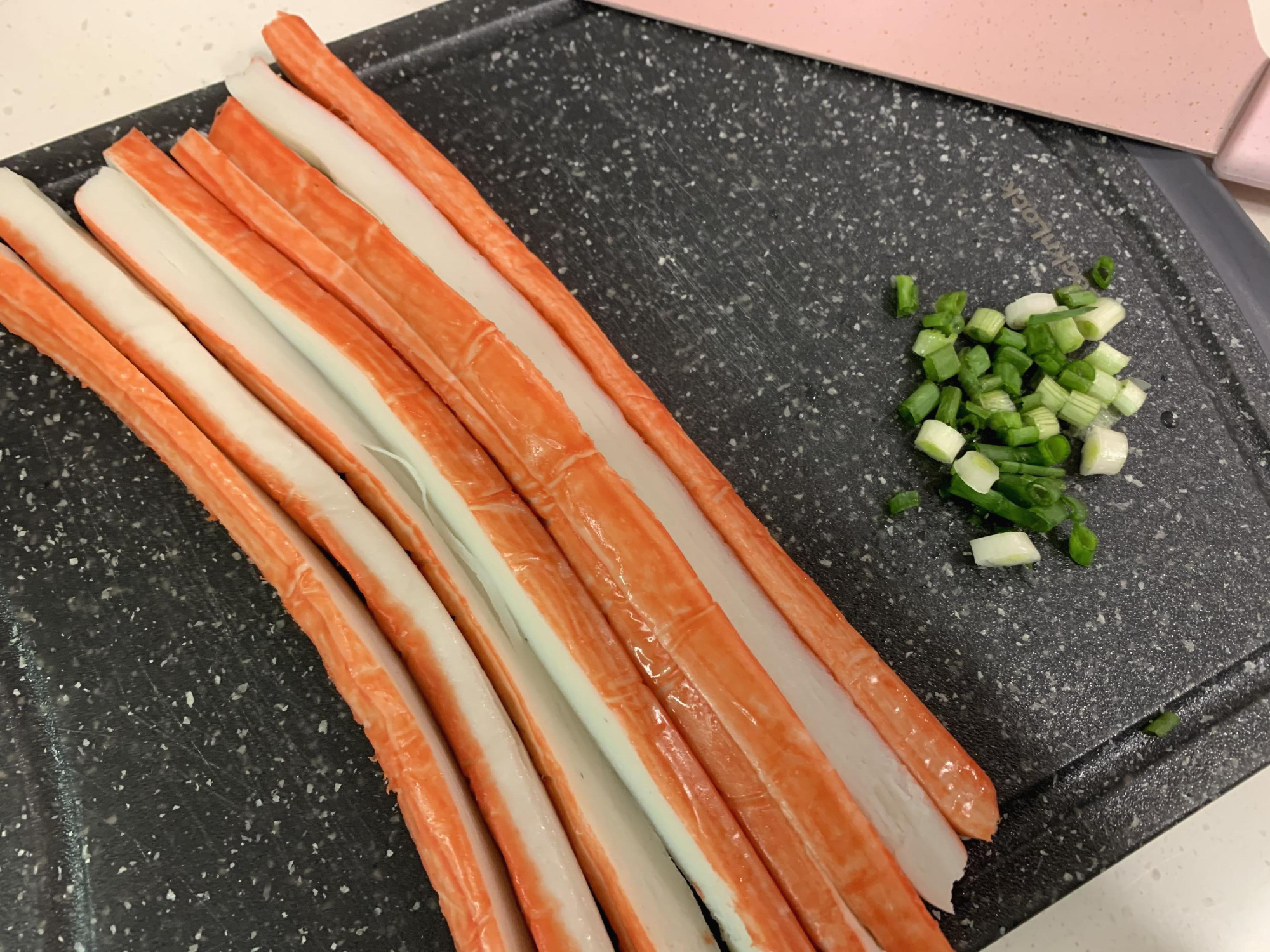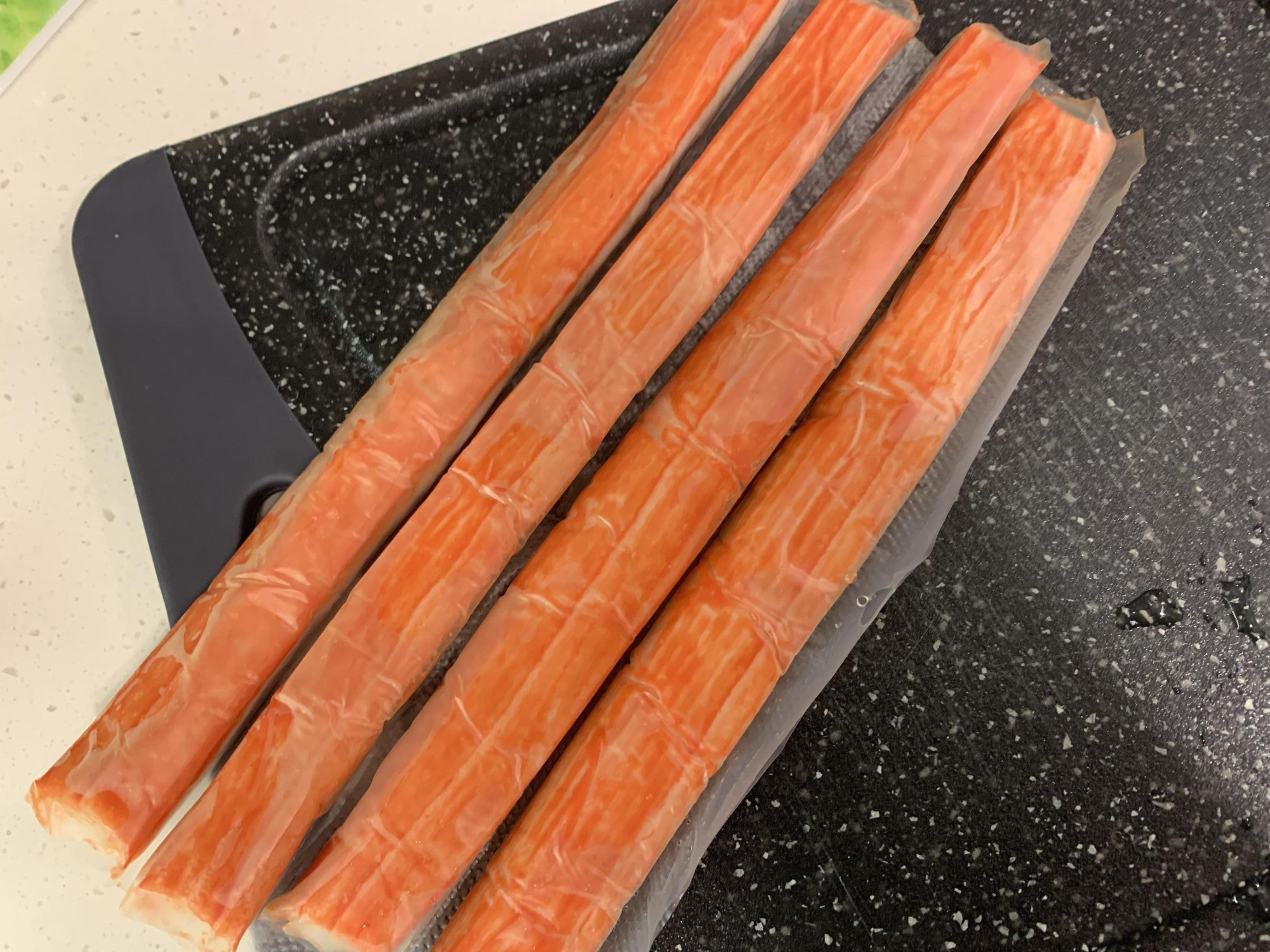 먼저 남은 김밥용 맛살을 반으로 자르고