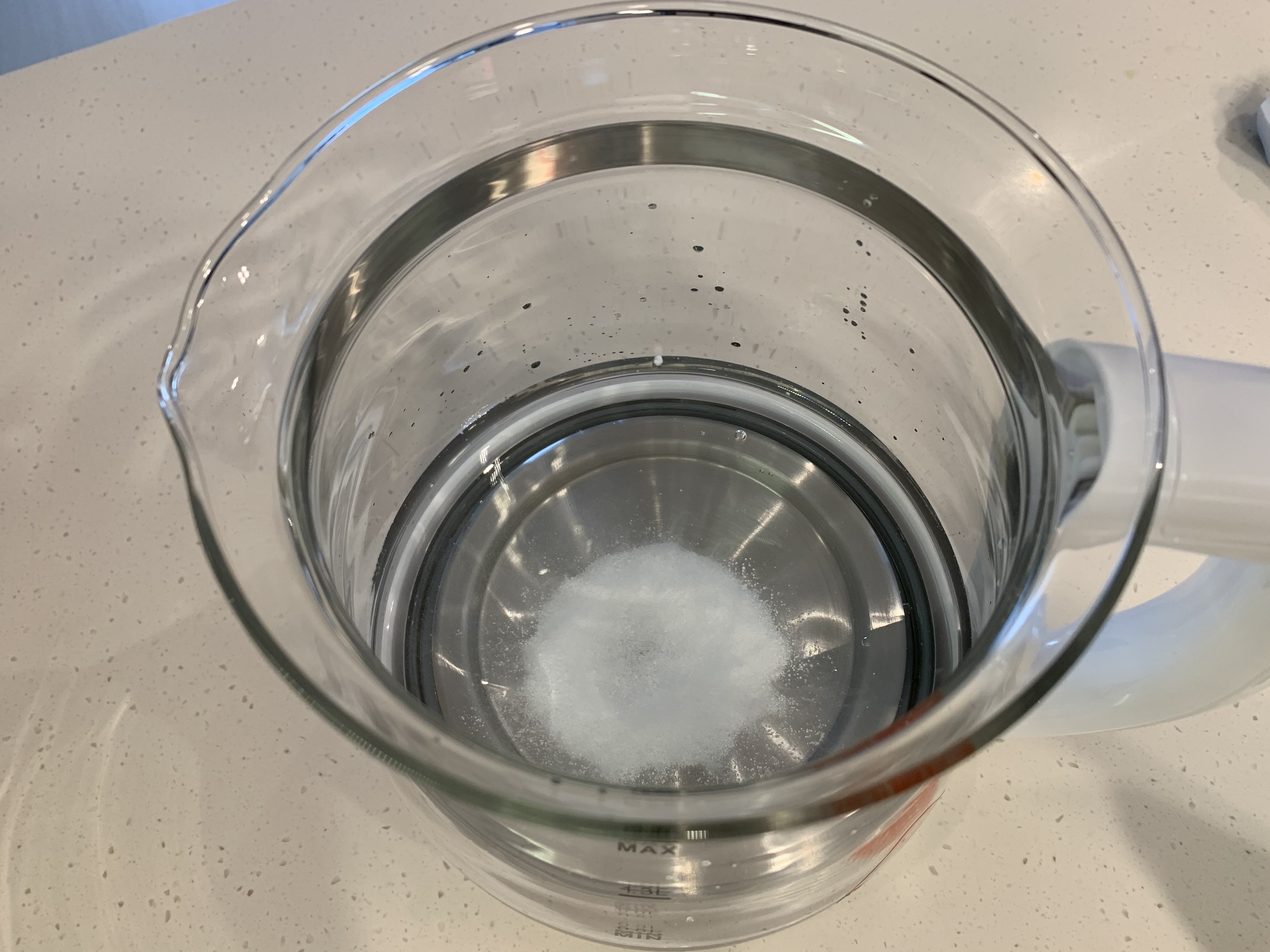 1. 유리 주전자에 400ml 물과 과탄산수소 한수저를 넣고