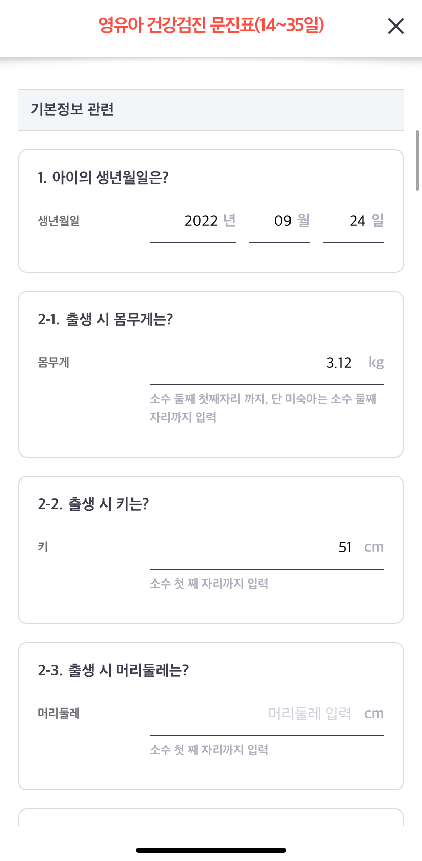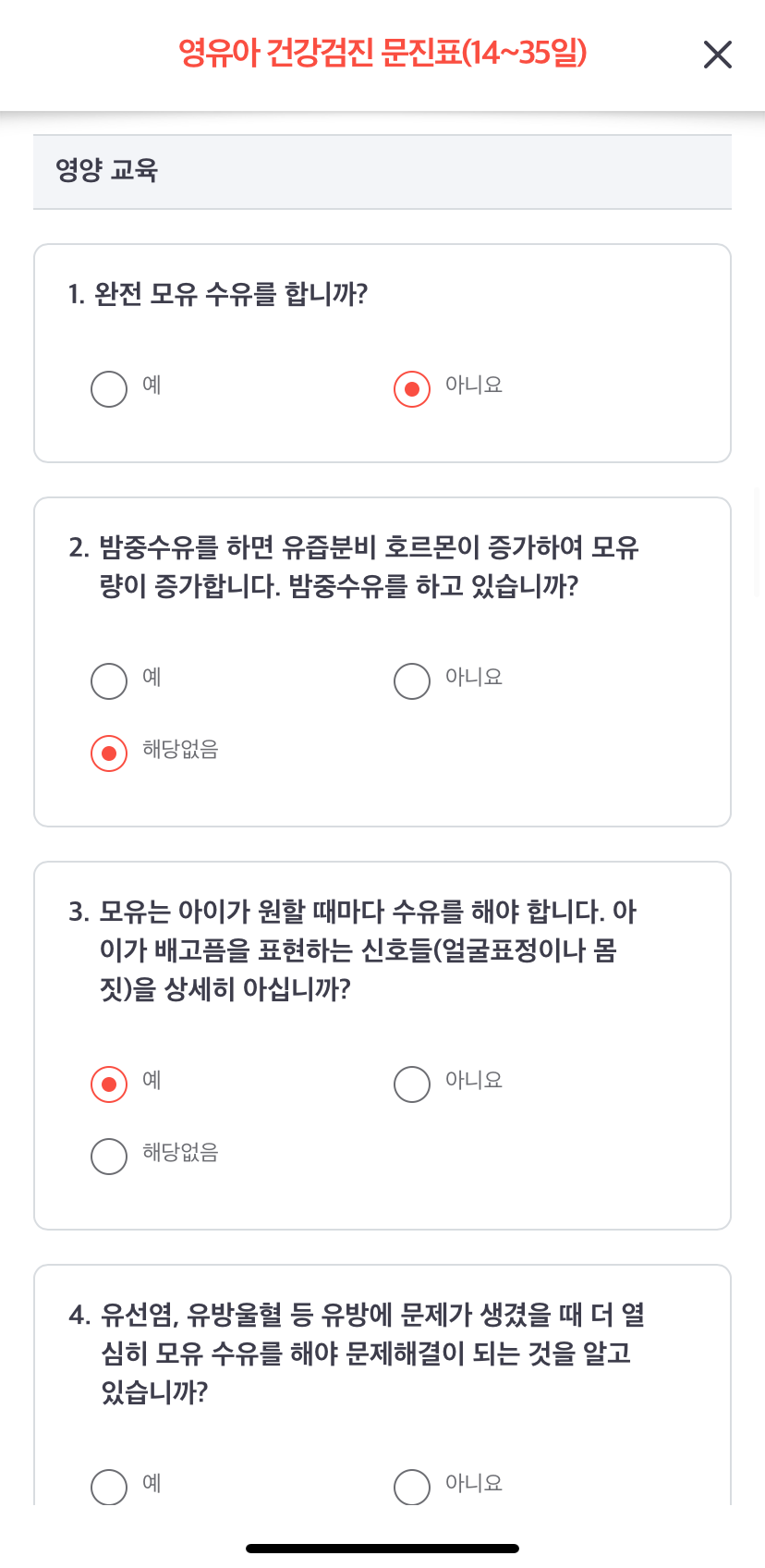 영유아 검진 대상 체크된 걸 확인 후 아래 문진표 작성 클릭